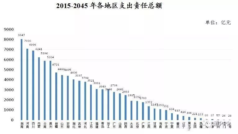 從地區分布看,中西部地區支出壓力較大。2015-2045年間,支出責任總額前五位的分別為湖南8047億元、河南7086億元、四川6906億元、內蒙古6241億元和云南5896億元,年均支出分別為260億元、229億元、222億元、201億元和190億元,分別占2017年本省一般公共預算支出的3.8%、3.1%、2.6%、4.4%和3.3%。