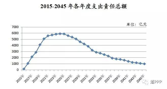 從時(shí)間分布看,各年度支出呈先增后減趨勢?,F有項目存量2024年支出責任總額將達到峰值,為5891億元,其后逐年下降。2017年支出責任總額為2101億元,約占當年地方一般公共預算支出(17.3萬(wàn)億元)的1.2%。